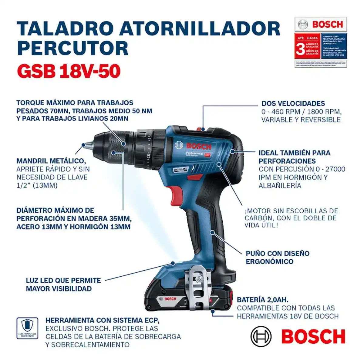 *****TALADRO PERCUTOR BOSCH GSB 18V-50 (1 BATERÍA 2.0Ah)